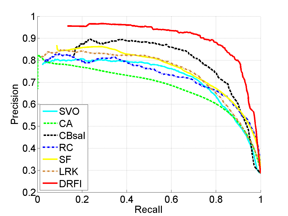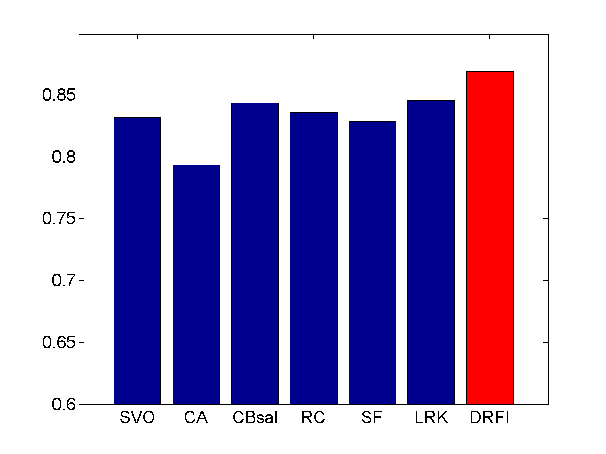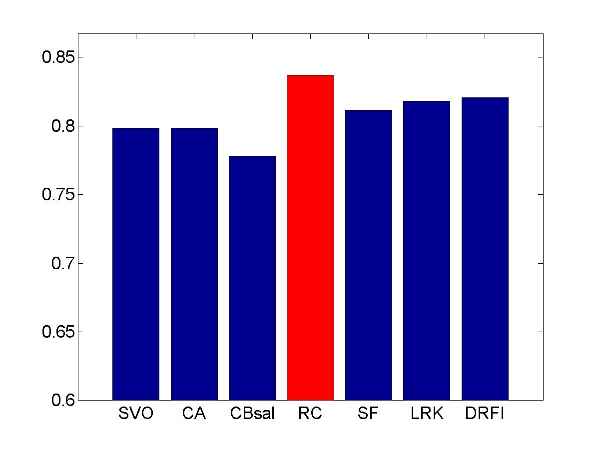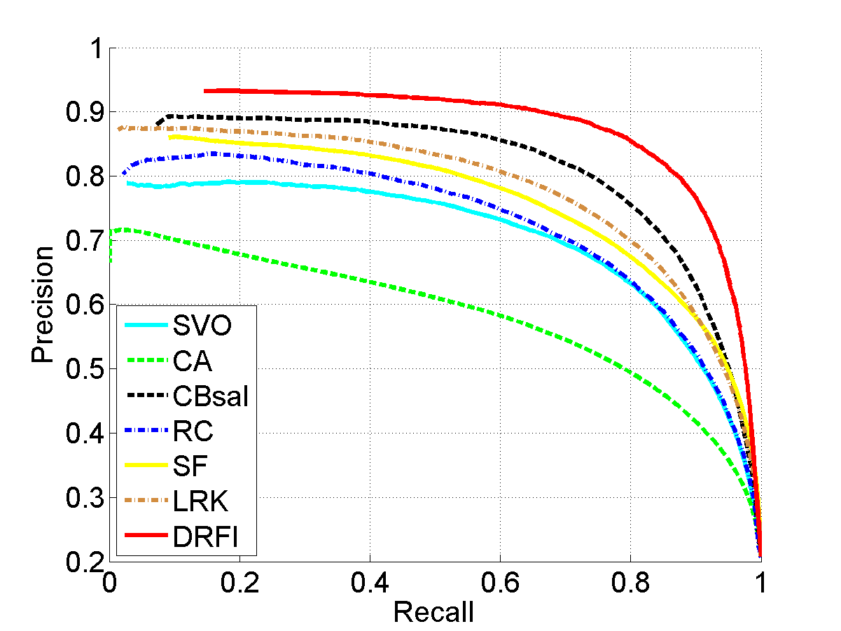 From left to right: input images, results of SVO [1], CA [2], CBsal [3], RC [4], SF [5], LRK [6], and our approach (DRFI), respectively. Please see the paper for details.