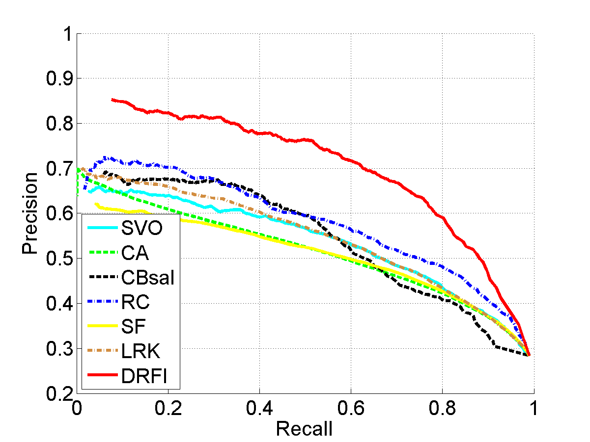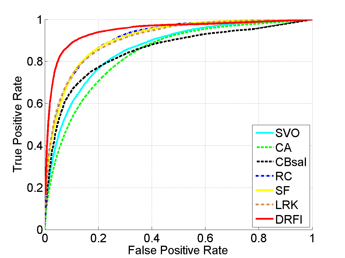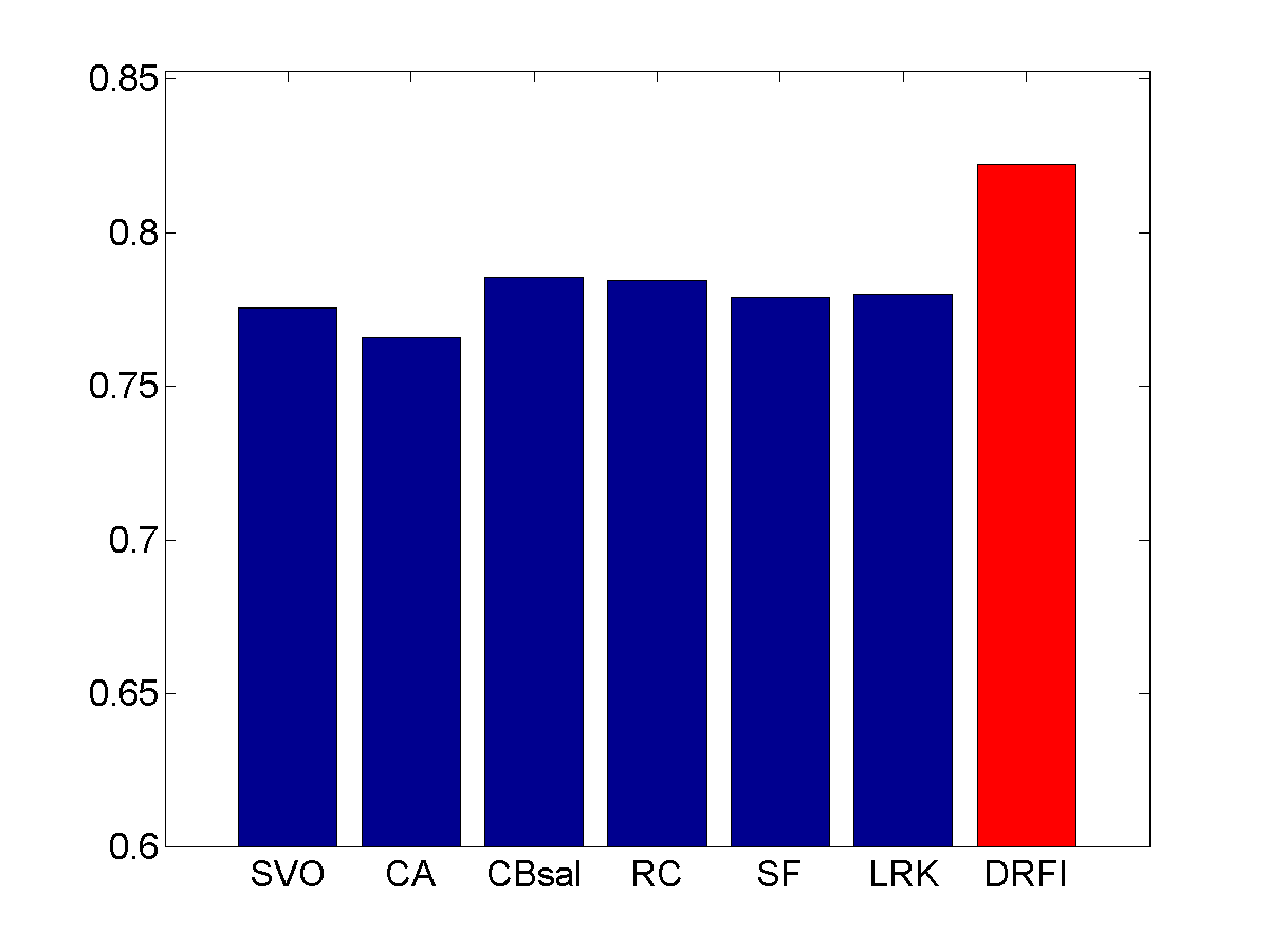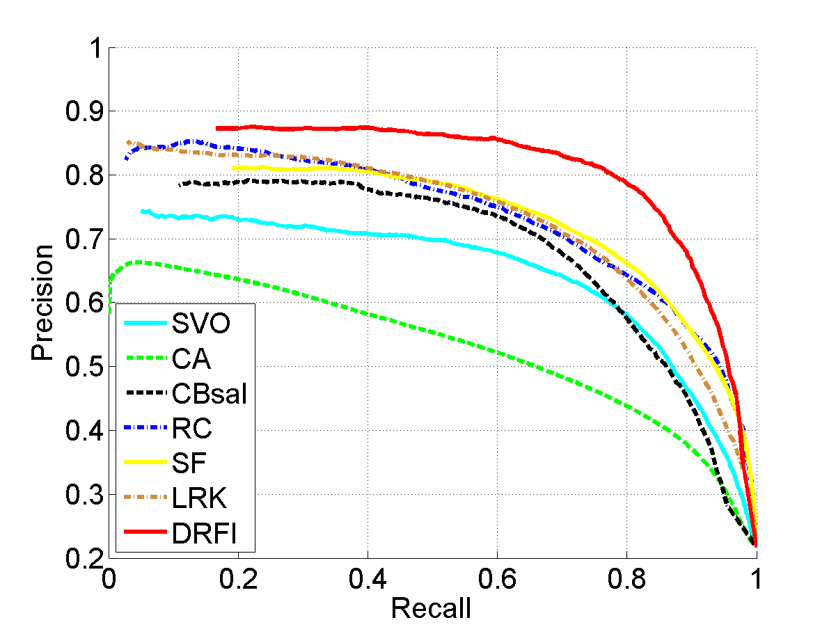 From left to right: input images, results of SVO [1], CA [2], CBsal [3], RC [4], SF [5], LRK [6], and our approach (DRFI), respectively. Please see the paper for details.