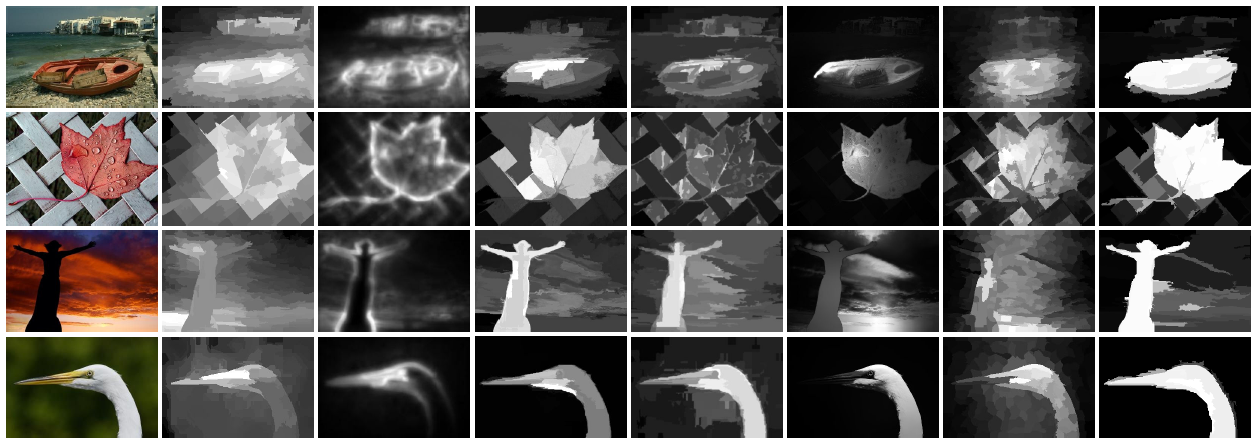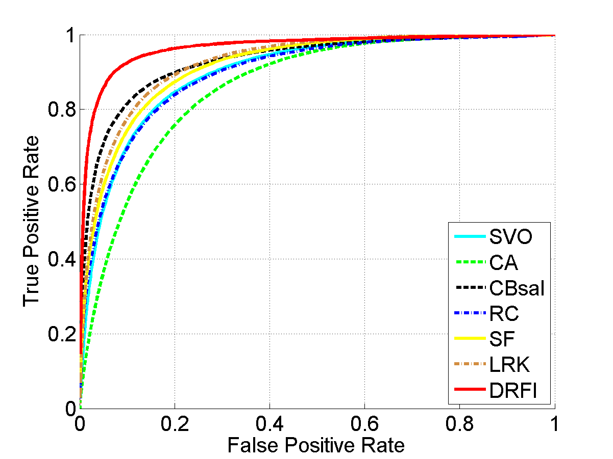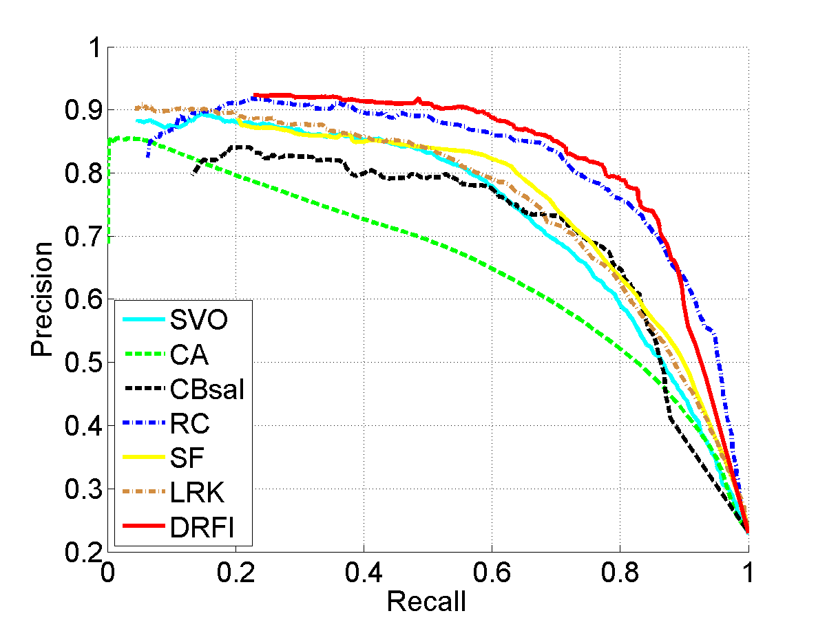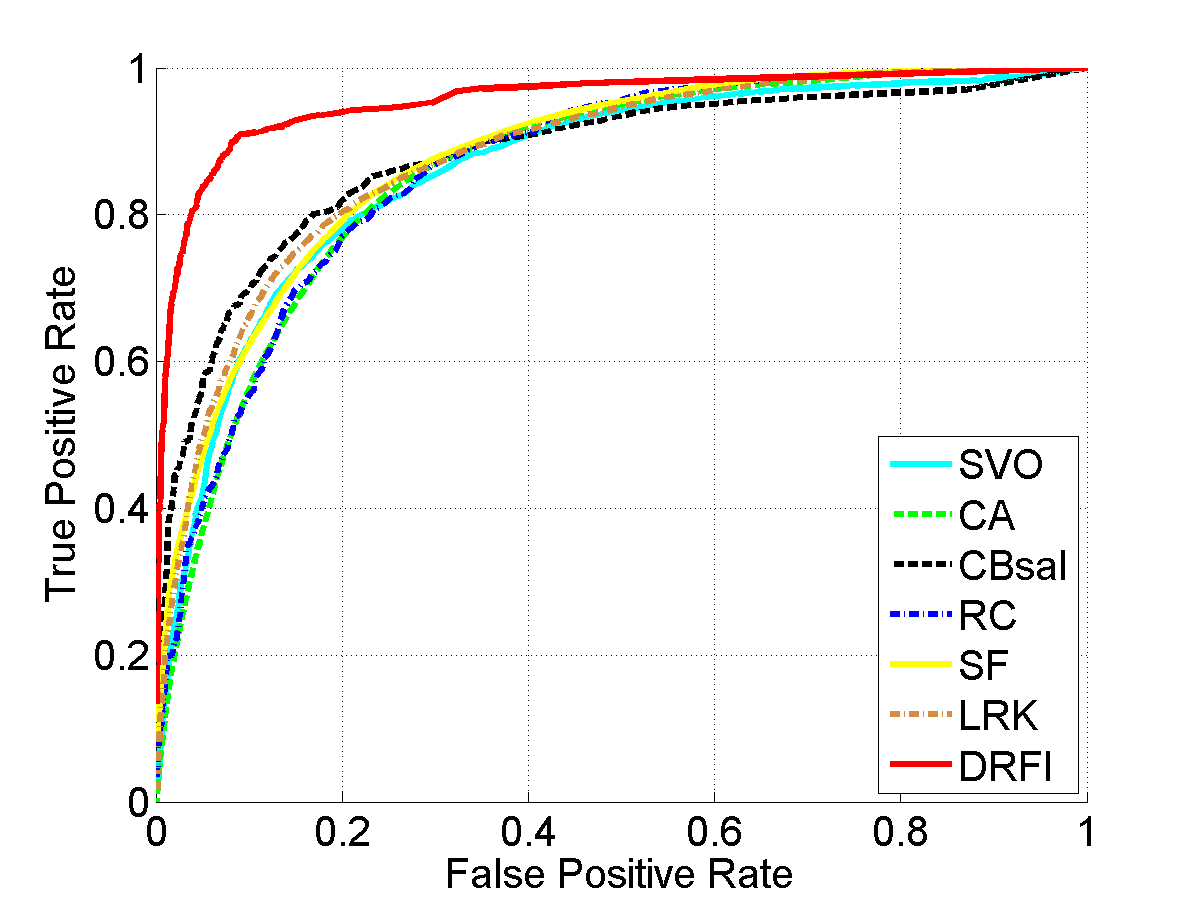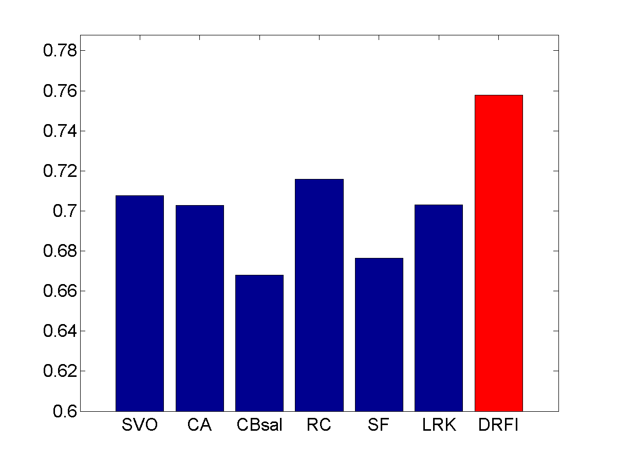 From left to right: input images, results of SVO [1], CA [2], CBsal [3], RC [4], SF [5], LRK [6], and our approach (DRFI), respectively. Please see the paper for details.